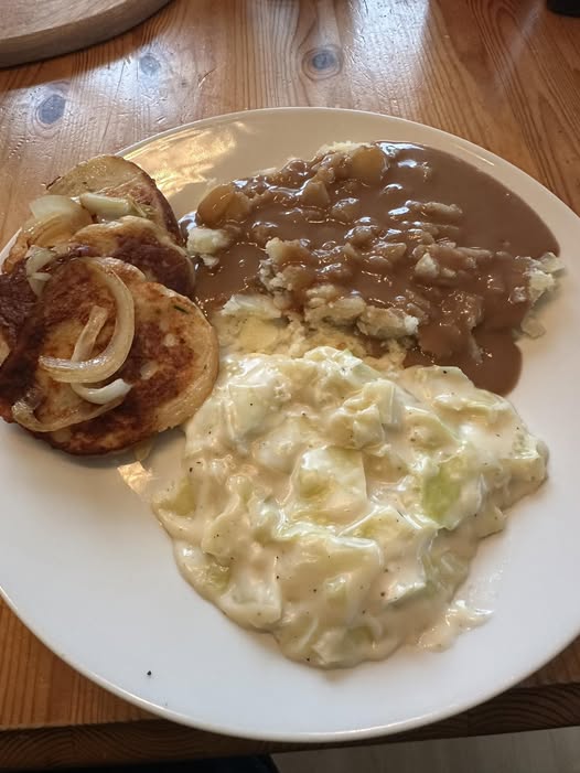 Serveres med stekt løk, poteter og gjerne en klatt rømme eller remulade.