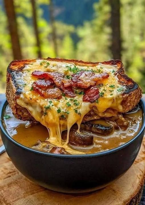 π Mushroom & Caramelized Onion Soup with Cheesy Toasties and Bacon